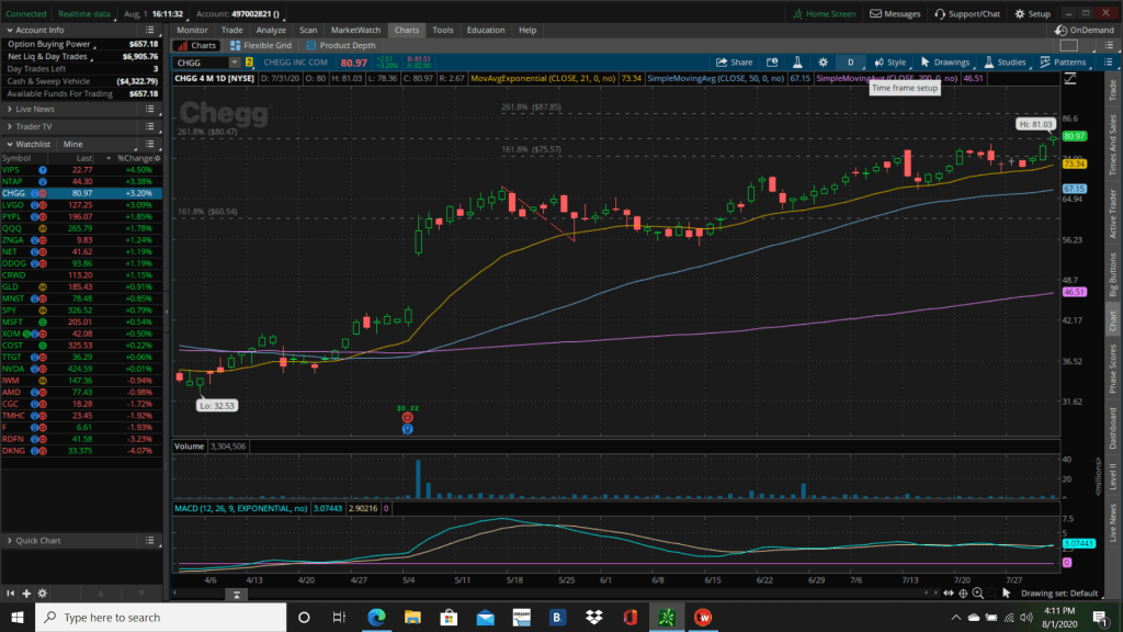 CHGG has been a nice position for me. We’ve been in this digital textbook provider since around $60, and it’s been a pretty easy stock to trade around your position with, taking profits on a portion of your shares on the big up days and buying them back on reversals from the 21-day ema (yellow).
