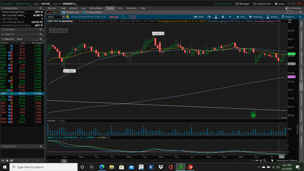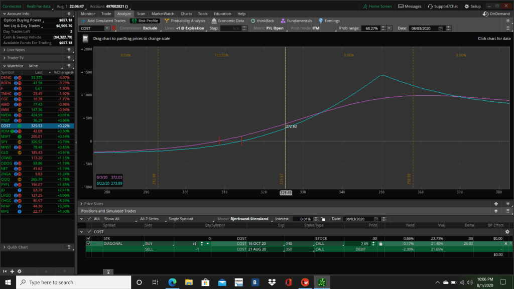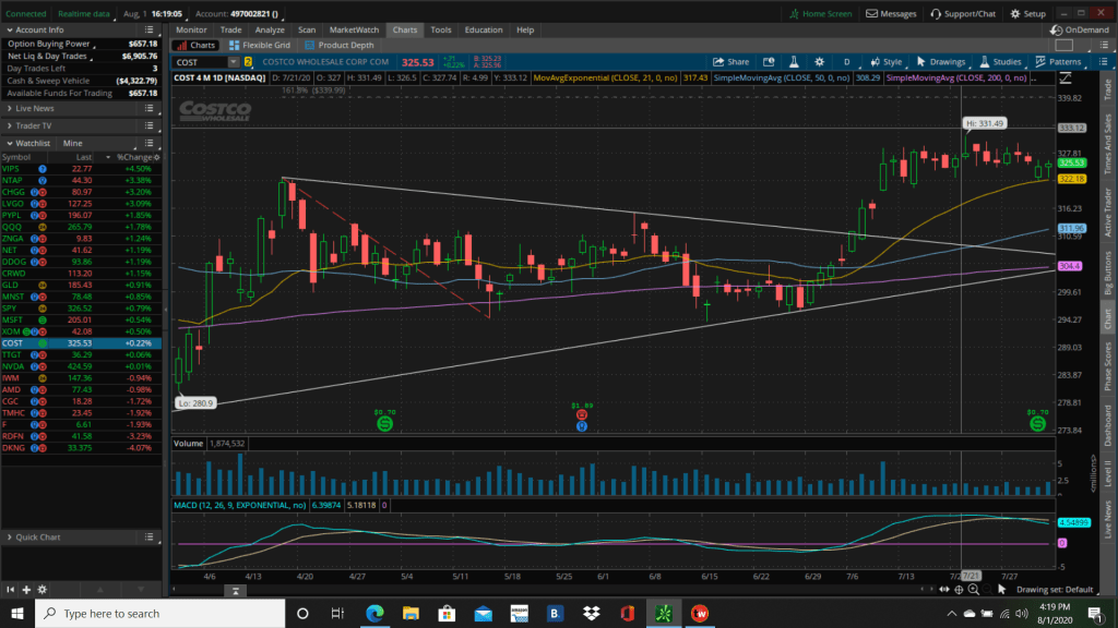 I played COST with a diagonal options spread, which means I own a $340 call option that expires in October and I helped pay for it by selling a $350 call option that expires August 21. This means I profit on any move up to $350 between now and that day. I paid $265 for that spread and currently hold $375 in profit, so that’s been a nice call. I entered this one on the day it broke through the trendline, seen below.