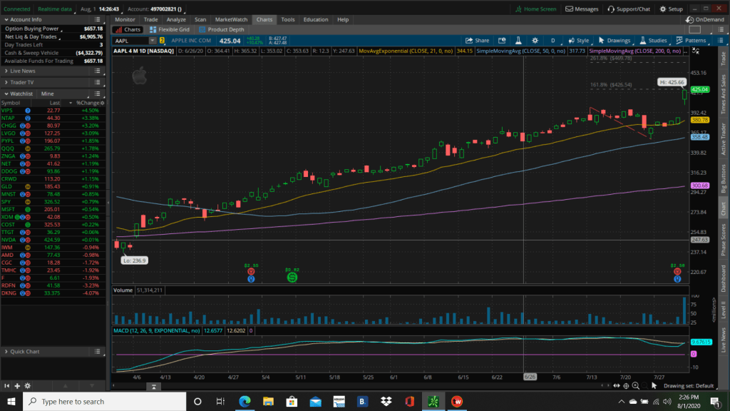 Now on to our positions in the Freaky Fast Folio and what we will be looking at in the week ahead. First up is AAPL. Apple posted one of the greatest quarters in the history of American business this past week. Their power and positioning in the market is so grand that they have the ability to voluntarily close stores down, as they did this quarter, and still achieve massive growth. Personally, I don’t trade AAPL much because it’s usually pretty boring, but I did have two shares from around $350 and I added a 3rd share at $404.