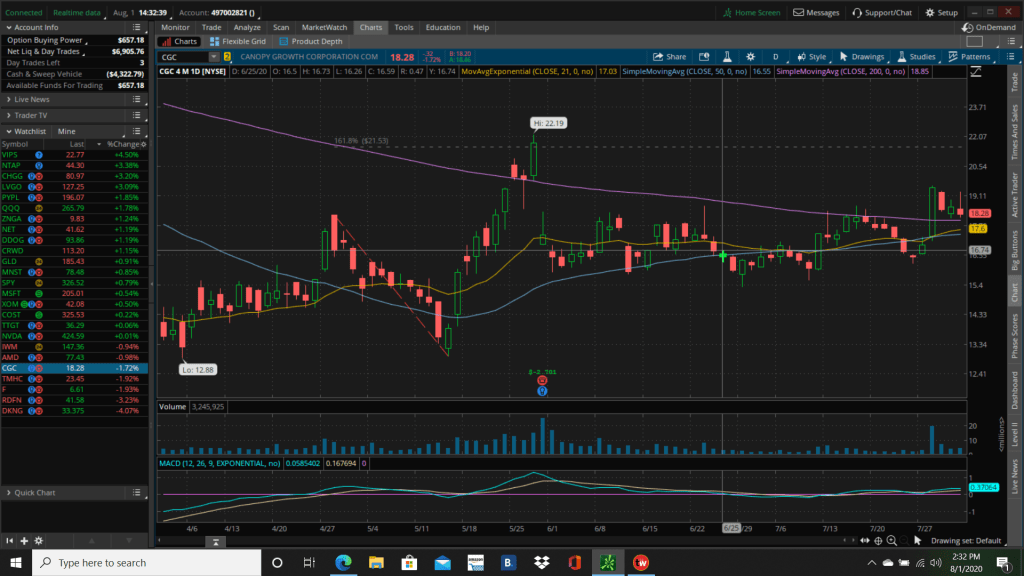 On to the weed. CGC is a train-wreck of a stock to trade, but it does have some big runs up from time to time, and it’s actually in a fairly good spot for one of those runs if it can break this $20 level.