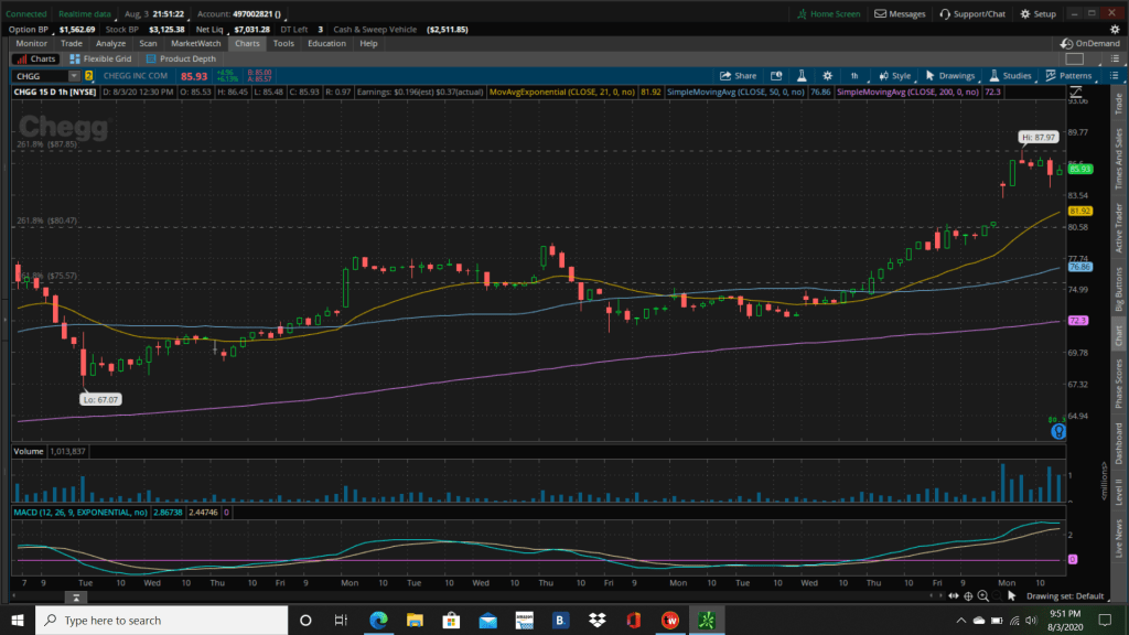 I closed out of our shares in the QQQ, not because I’m not bullish the index, but because I wanted to get off margin and start getting some cash on hand for the next pullback. Tomorrow I will do the same with my shares in the SPY. I sold a couple shares each of VIPS, NET and TTGT. And with CHGG reporting earnings and with me having a large profit on it, I sold CHGG when it reached my profit target at the top of the day.