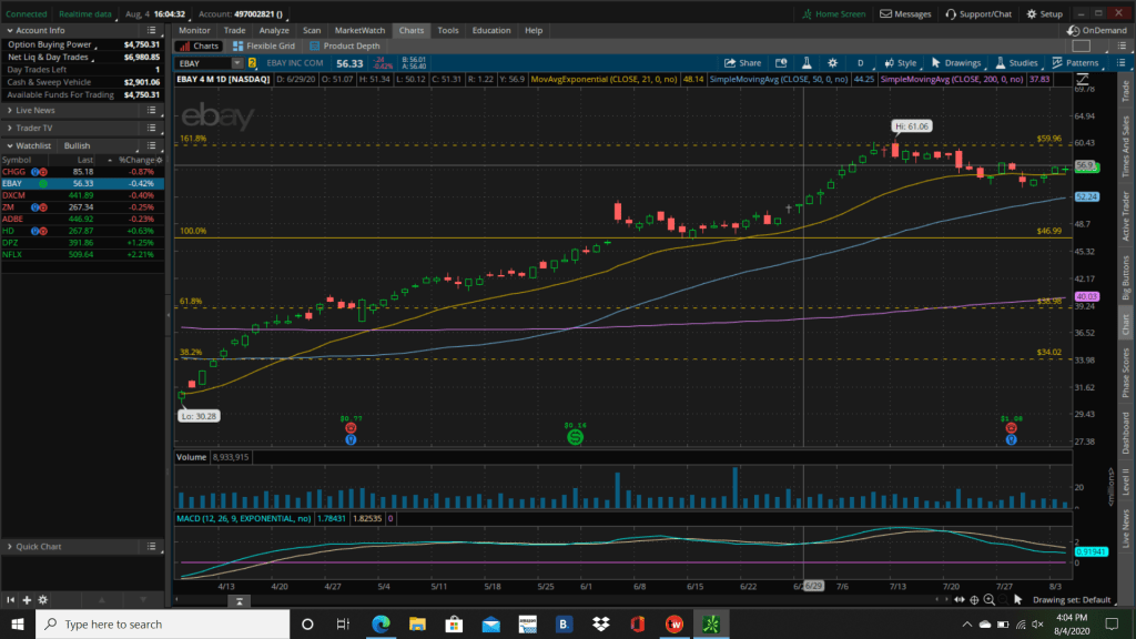 We should have support on the hourly chart below, as EBAY has pulled back to the 200-hour moving average and appeared to lift from there. I’d buy this above $57, which would be above the downtrend line. You can place a very short stop-loss at around $54.20. Shares work, of course, but I think I’d prefer to buy a September $60 call. You can currently buy that for $127. Then if EBAY rallies to the $60 area I’d sell an earlier expiration $65 call against it.