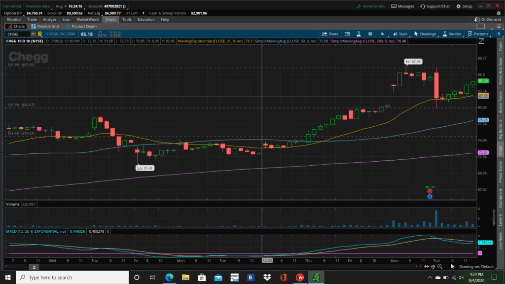 We sold CHGG yesterday above $87.70 because we had big gains and it was announcing its earnings after the close. Too much risk. The announcement went well, the stock dropped a bit, but rallied well from a key support zone, and now we may have a great chance to buy this back at a small discount. Look at how Chegg has traded precisely between my two targets (the dotted lines) the last two days.