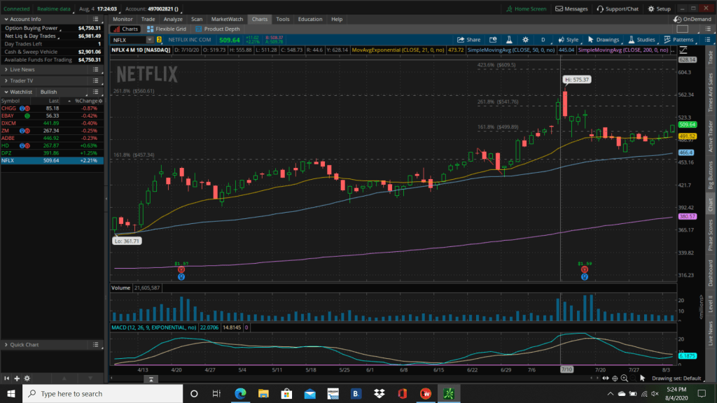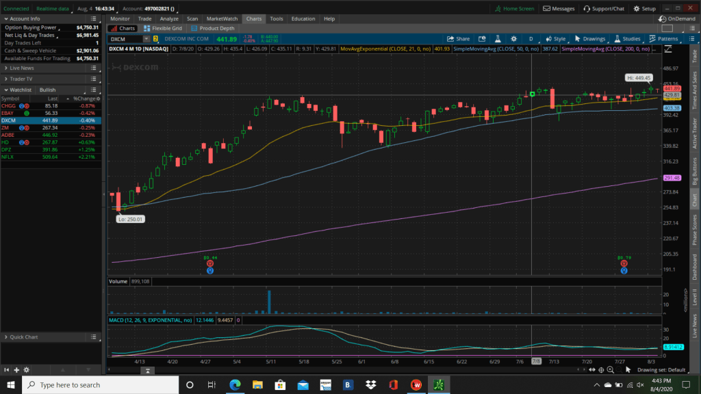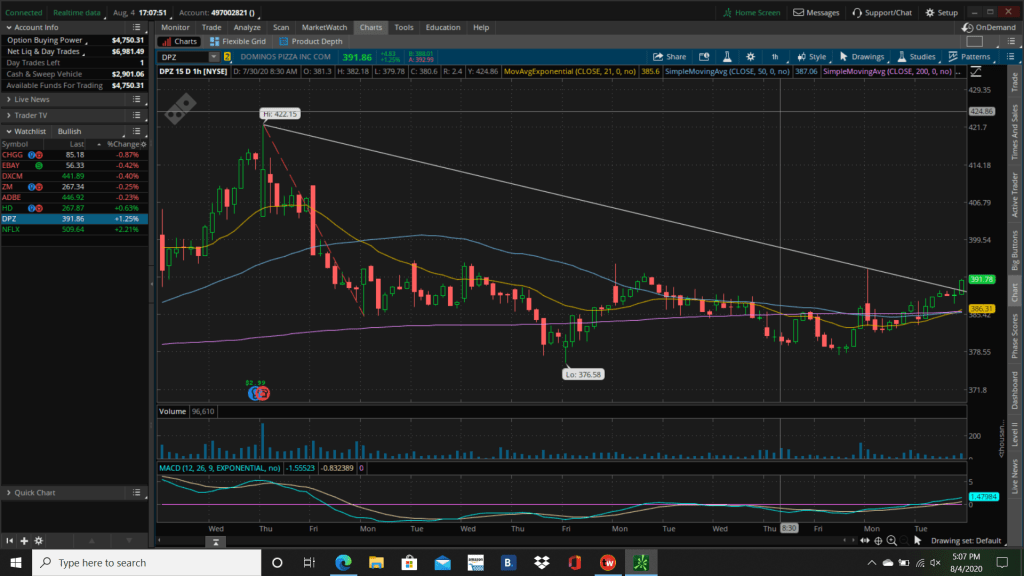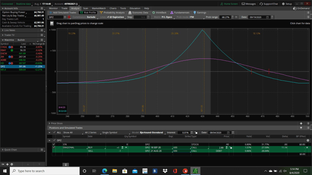 On August 21st you’d have profits if DPZ is anywhere between $400 and $460. You’d have profits of $500 or more if it’s in the area where I expect it to be, from $418 to $442. My stop for this is going to be around $382 if I get in it, which means I’d probably lose about $125-150 if it fails.