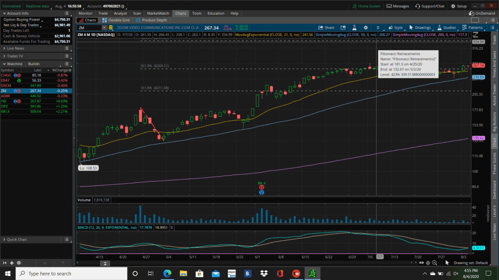 Zooming forward, let’s talk about ZM. Zoom reports on 8/31, so we’ve got plenty of time to get some real profits in this one before the earnings announcement. Looks to me like there’s a good 20% to be had, if the market holds up. Zoom has a 99 rating and is also 1st in its industry group. I’d buy above $271.50. I’ve got a stop below $250. You can use stock, or another thing I’d consider is the Sep $340 call. If ZOOM gets near that $340 mark before its earnings call, you’ll out-do the quadruples we sold earlier today.
