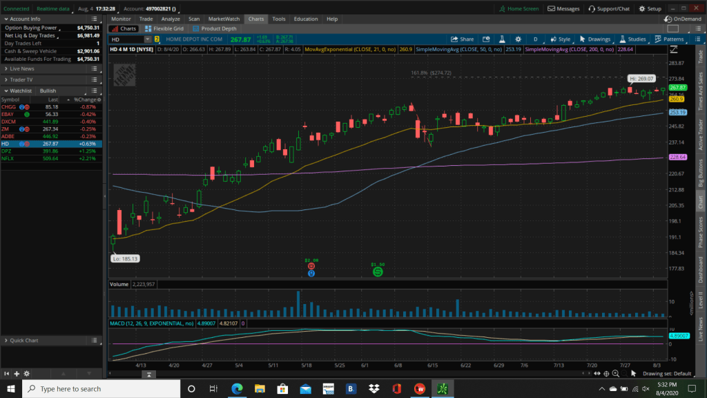 Last up is HD. The Home Depot has an 85 rating and is also first in its industry group. HD is buyable above 269.20. I see a run towards $300 into earnings on the 18th. The great thing about the despot is that it can move pretty quick if you catch it right, but people don’t think of it as a quick-mover, so the options prices are low. I would just buy the Sep $290 calls for about $210, watch it go up, and then before its earnings announcement take your profits, or sell an Aug $300 call against it. This is another potential quadruple gainer.