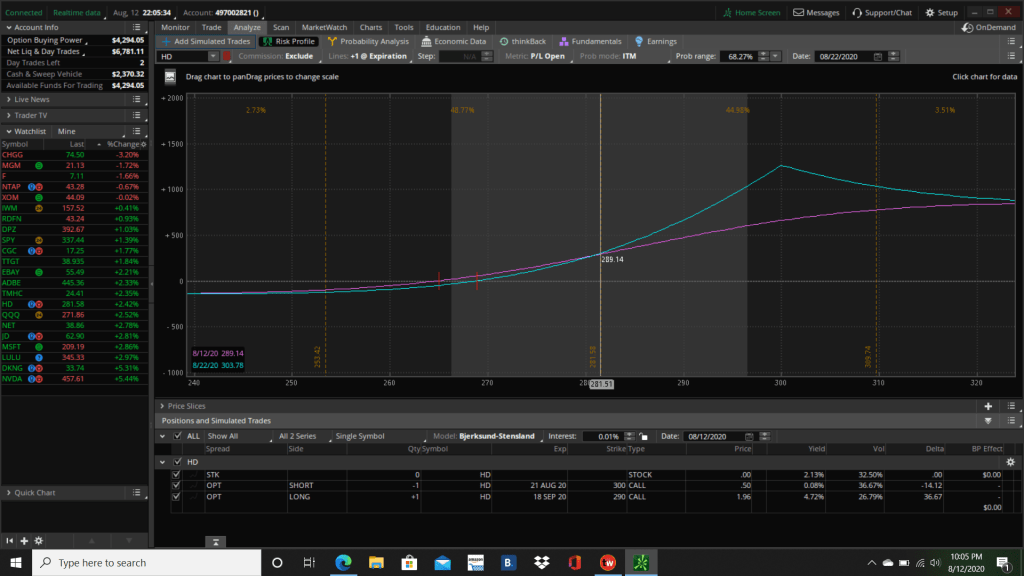 Big winners today were the options positions on NVDA and HD, and DKNG. Here are the P+L graphs for the options positions.