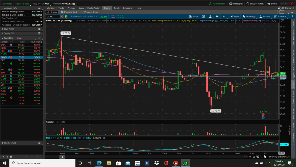 We also sold out of our JD options position for a loss of about $35. I wasn’t loving the action in the Chinese stocks lately, so I didn’t want to take the earnings gamble.