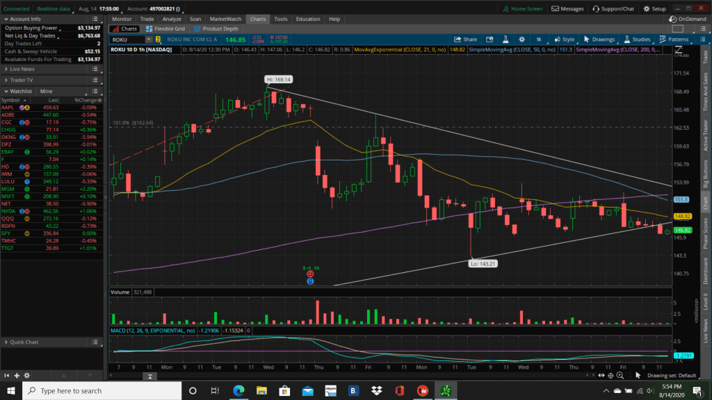 Lastly, I shorted ROKU at around $147. Why did I short ROKU? This isn’t some case where I’m pounding the table arguing that ROKU is going to $100. I’m not even arguing that ROKU is overpriced, because everything I own is overpriced by traditional price to earnings valuations. Things can stay overpriced on a P/E basis for a real long time (like AMZN has been for its entire life as a company) and let’s be honest here, how serious can a valuation model be which doesn’t take into account earnings growth or projected forward earnings growth? I love ROKU as a company too, and I was in it for its run from $130 to $160. So why am I short ROKU?