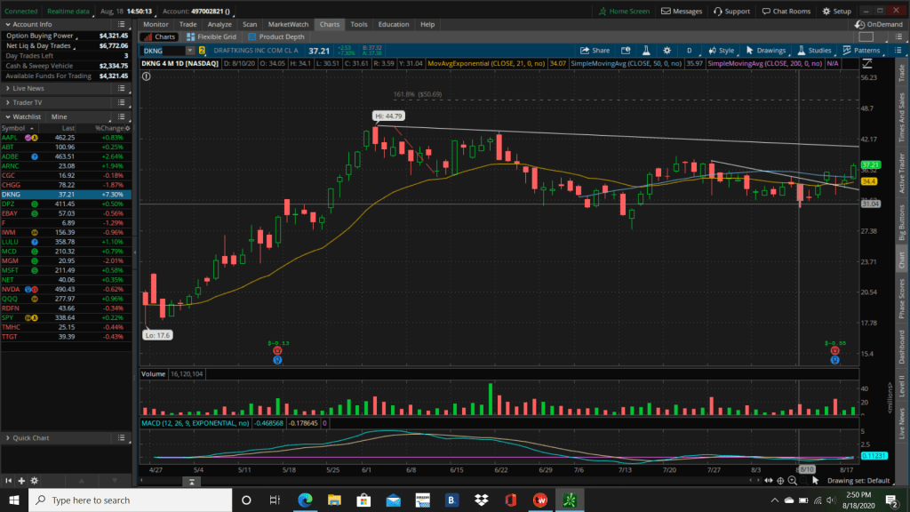Today’s big gainer was DKNG (long live the King) up 7.3%. It is now up nearly 18% from 8 days ago, when I called it a screaming buy, and looks poised for more. We made almost $100 there.