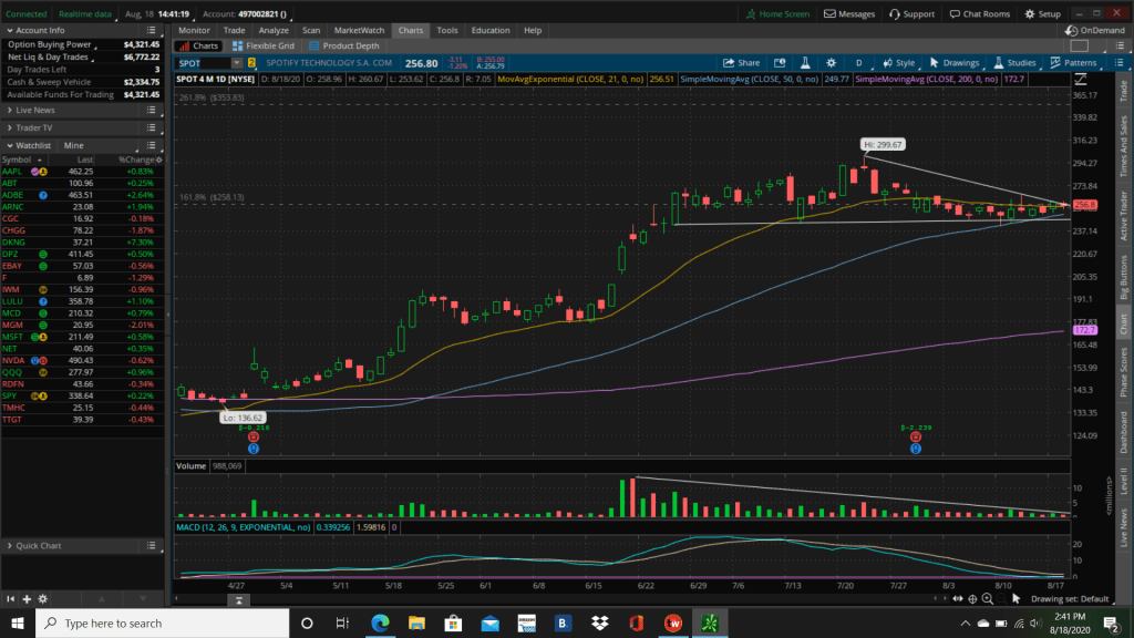 We broke a rule of mine and bought a SPOT Oct $350 call for $245 on the open as it briefly popped out of this chart pattern. (Don’t buy options on the open without selling another option against it.)