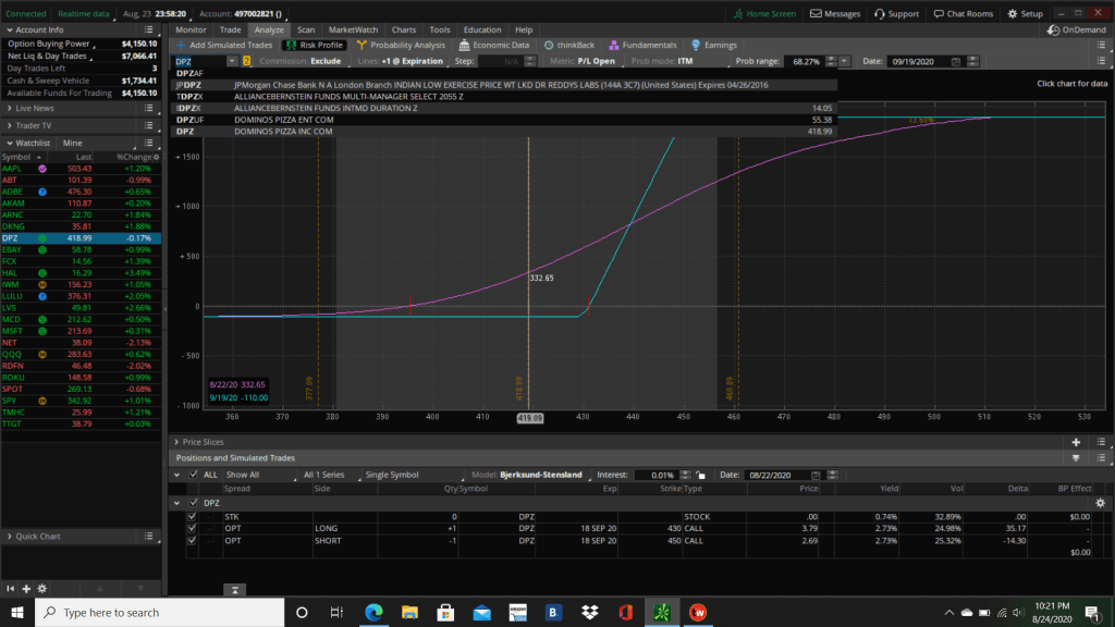 Also on Friday, we bought back our Aug 21 DPZ call so that we could sell a September $450 call for $269 against the Sep $430 call that we own. We booked a $55 profit on the call we sold and even after a bad day for the position today, we have nearly $400 in profits, or about 130%. Currently the P+L graph looks like this, although this is not counting the $55 we already booked: