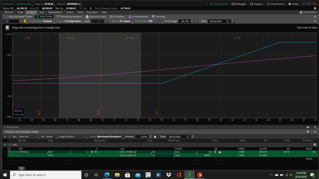 We got a little more diversified today, adding some value and materials to the mostly technology positions we held. I bought a 3/4 position in FCX stock at $14.52. Then two options positions. I bought two Nove $19 HAL calls for $146. You can still get that price. Lastly, I bought a vertical spread in LVS, buying the November $55 and selling the November $65 for $195 net. This position looks like that: