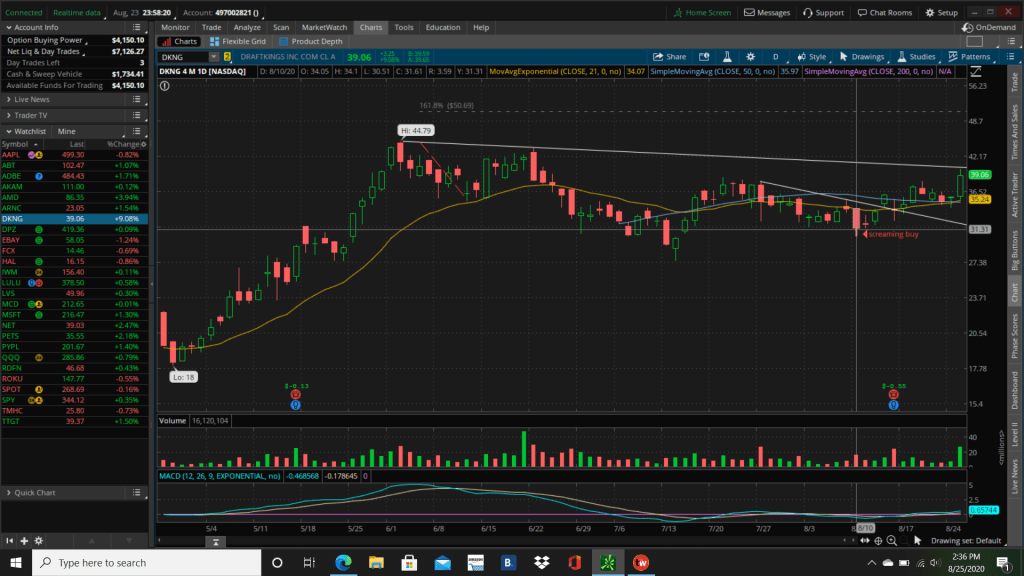 That big down day on August 10 went a long way towards getting rid of the share owners who have no clue what DraftKings’ business is. They are not sports betting in the sense that you login and put down $50 on the Yankees to beat the Blue Jays. They are daily fantasy sports, a game of skill, where players who want to win money must spend a good couple hours a day researching and coming up with a lineup of players to compete via stats for a pool of money. They benefit hugely from people being home, and they are not impacted by things like college football potentially not being played. Why? Because nobody plays daily fantasy college sports. How many college football fans do you think know all the skill position players on all the 200 or so major college teams well enough to compete effectively? I’m a sports fanatic, and I don’t. So when DKNG falls 10% on news that college football was being cancelled in some places, that’s a false move. DKNG didn’t even MENTION college sports in their earnings call; that’s how little of a piece of its business it is.