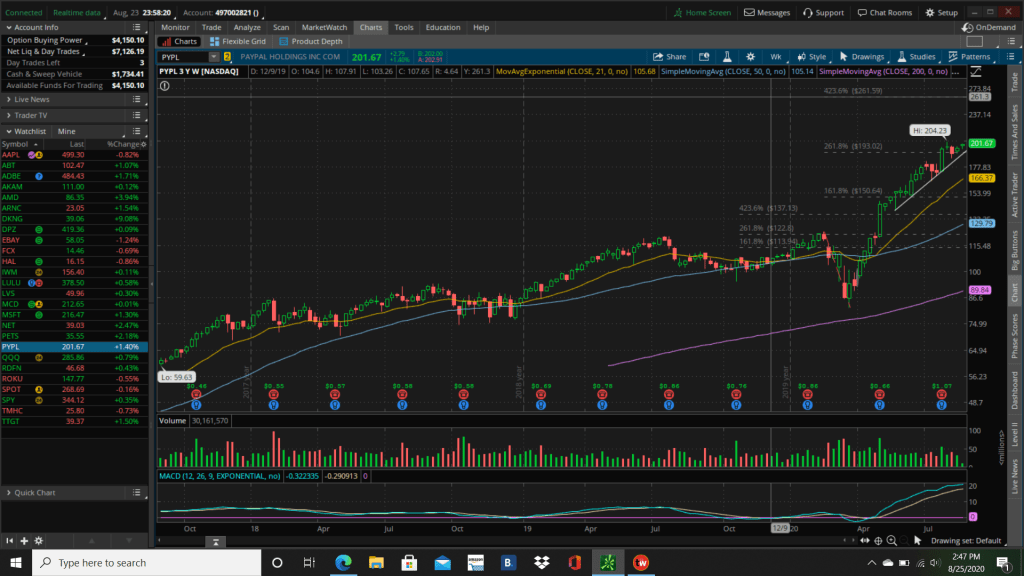 I added PYPL as it broke above $200 at $200.44 per share. I make a lot of purchases as stocks cross round numbers, as it is psychologically key to many shareholders. In fact, earlier this year, I first got into PYPL as it crossed $100 and held it (trading around the position, selling some on the rips and buying some back on the dips) to $195. After being out for most of this month, it looks prepared to run again. You can see my next target for it below, around $261.