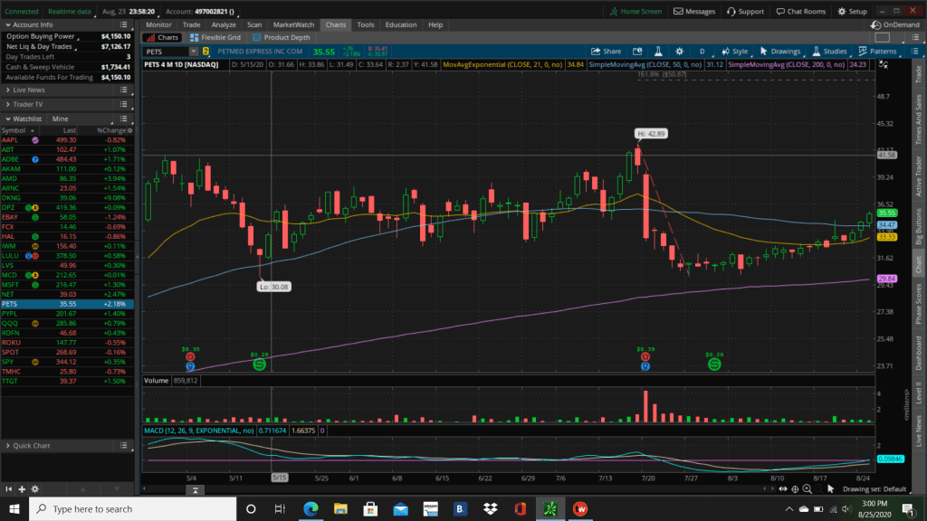 Lastly, we added a half-position in PETS stock at $35.57. It was only a half position because I like to keep my pets on a long leash. (Sorry.) Despite the massive selloff last month, PETS still has a 96 rating at Investor’s Business Daily, is in a great group with good EPS growth, and it seems to have digested its loss and is now above all my moving averages. That resistance at $42 might be a challenge to get through, and I’d probably take some profits if it got there, but if it does, $50 is next.