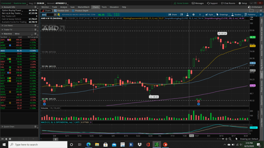 Next up, we added AMD at $84.82. I sadly took profits (lots of them, but not nearly as much as it could’ve been) when it was $62/share. Thankfully, I used some of that money to get into the NVDA options play that we quadrupled our money on, so that was fine. But after selling NVDA into earnings, I felt I needed a semi-conductor stock. AMD is the next best and it looks ready to go for more.