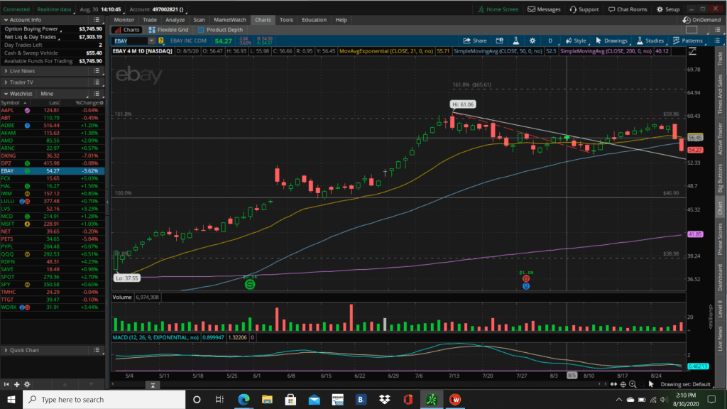 We started out the day by selling all the $IWM and $SPY stock I bought a couple days ago to raise cash. Then we sold and took a loss on our EBAY call. That stock just hasn’t traded well at all since we bought it on September 5, so we dumped it for a $92 loss. It’s important to learn from your mistakes, if mistakes were made. In this case, I bought too early on the highlighted day below where it failed to break above the downtrend line.