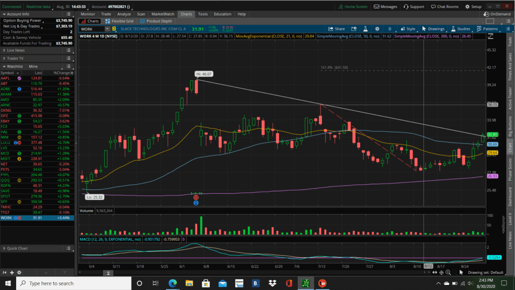 Then we added a new position, buying shares of Slack Technologies (WORK) at $32.06. You can get it a little cheaper perhaps on the open tomorrow. This was bought in the exact same manner as the failed EBAY trade, but below you can see how much better it looks at the close of the day.