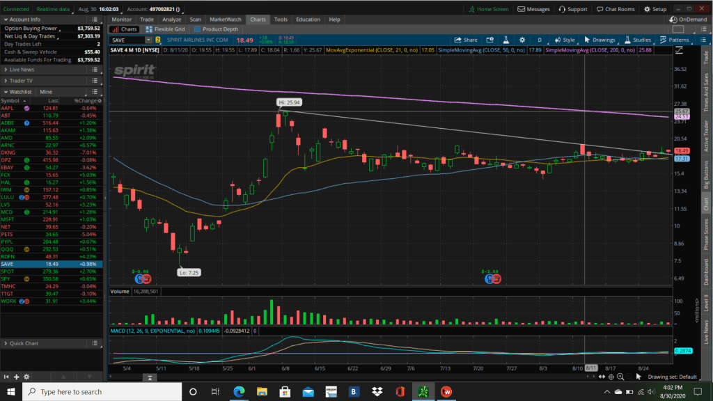 Lastly, we entered a position in Spirit Airlines (SAVE) using options. This is an ideal options use. Potential for a quick, large gain. But also the stock could potentially have a quick, large selloff if negative things occur. Options define your risk and maximize your reward. We bought the Oct $20 call for $199. The plan would be to watch that go higher and then sell the Oct $25 call against it at a higher price than they currently are selling for. The most likely result of a chart that looks like this is that it hits the purple line next.