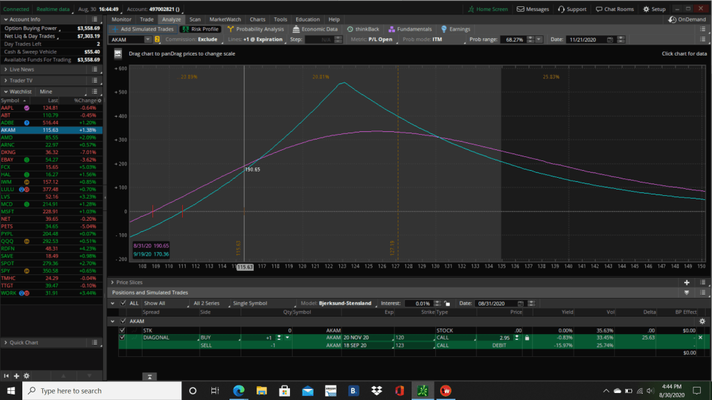 UPDATED: I forgot to add that we adjusted our $AKAM position by selling the Sep $123 call for $95, against the Nov $120 call we bought last Friday. We are up $190 on the total position this week and the resulting P+L graph looks like this: