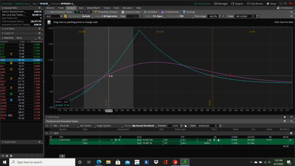 In GLD we bought the October $185 call and sold a September $187 call against it, for a net cost of $248. This is the resulting P+L graph of that trade:
