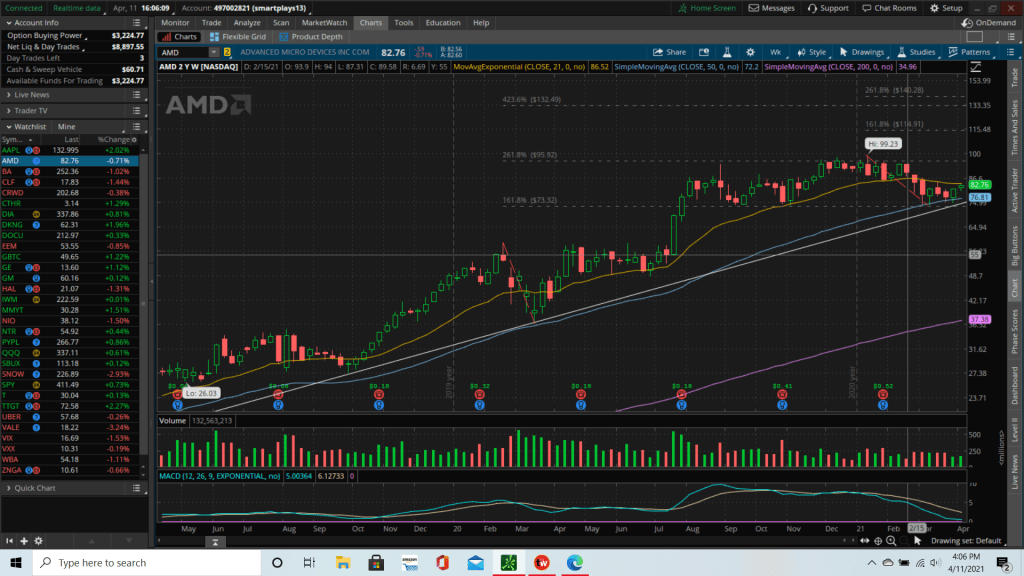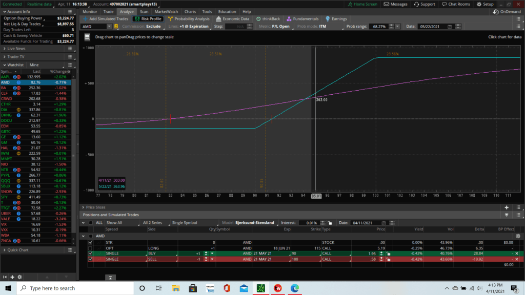 The biggest realistic risk to this trade is that it moves up too fast and you don’t sell your short May 14th call soon enough, and you make a lot less than you would’ve by being more bullish. I’m ok with risks that result in me making less money than I could’ve if I just decided to avoid being smart by protecting myself. If I only make $100 instead of $500 but I’ve made an essentially no-lose trade, that’s not a problem. And the downside risk is definitely there with this stock and the chip shortage, so I’d happily accept that tradeoff.
