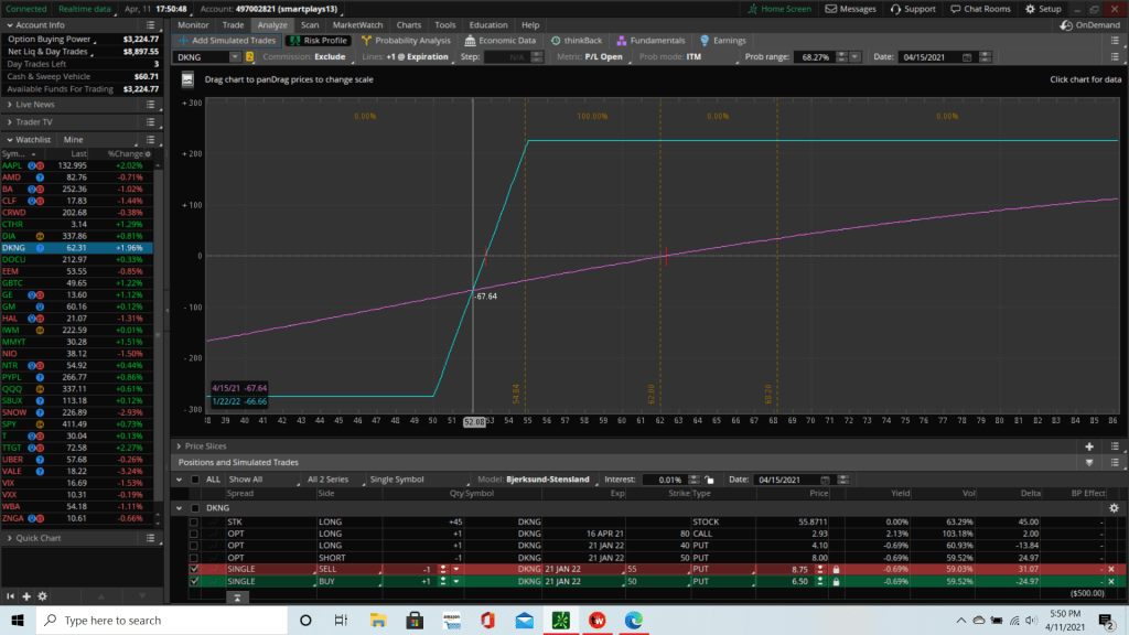 So we’re going to sit through a couple earnings reports and let the truth come out and get paid for waiting. Let’s sell the January 55 strike PUT for $875 and we’re going to buy the January 50 strike PUT for $650. They will pay you a total of $225 which will be immediately credited to your account, although it will count $275 against your margin balance. The goal is to keep your money and not have to buy it back for more than the $225 you received. If DKNG finishes January expiry above the 55 strike put we sold, we will have been paid $225 on $275 invested. That’s an 82% return in 9 months as long as DKNG doesn’t expire more than 12% down from where it is now after a 20+% pullback it’s already had. Here’s the P+L graph.
