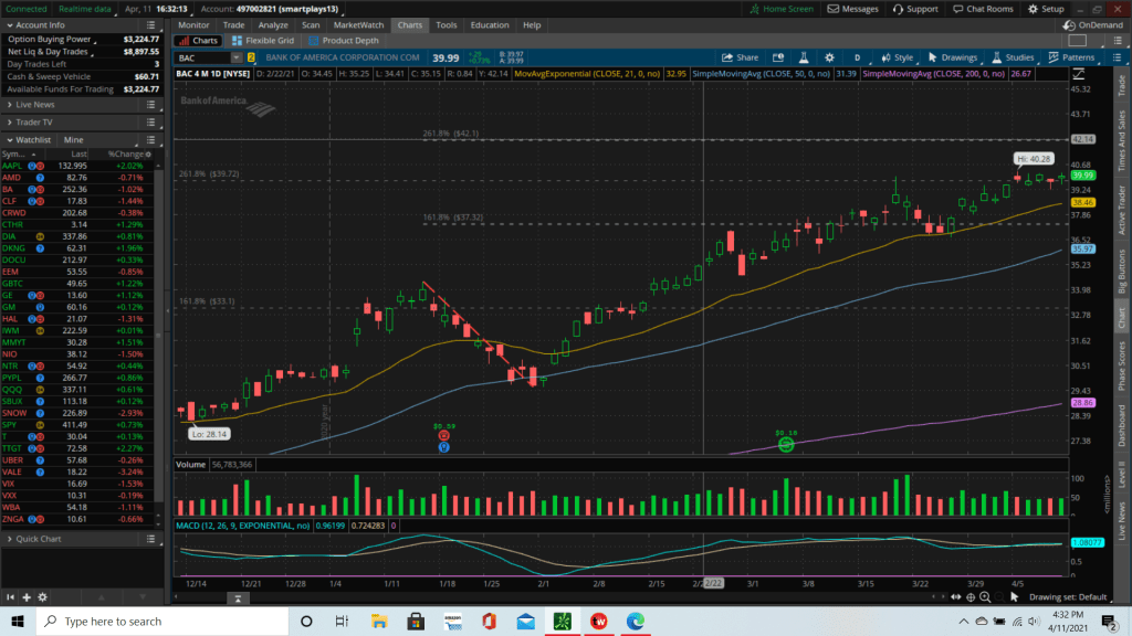 AMD showed one way to play an earnings report, but here’s one I like even better. BAC reports on April 15th before the market opens. We’re going to make a longer play on BAC’s continued strength by buying the August 42 strike call for $190, and we’re going to offset that cost by selling the May expiration 42 strike call against it for $78 credit. This is called a calendar spread, because you are spreading your options across the calendar, not at different prices. I chose August to buy because that will be after the NEXT BAC earnings report in July, and that call will retain a lot of its value as we head into THAT report, as long as the price action is good. I chose $42 because that appears to be a reasonable next target on the way up for BAC, given this chart.