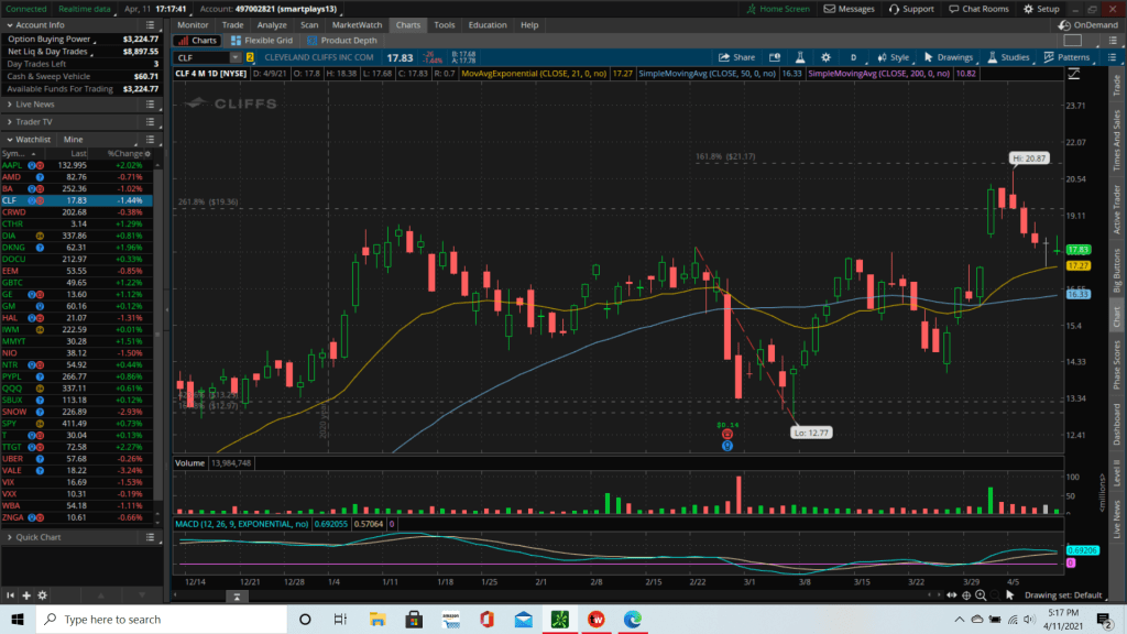 Onto my good friend, Cleveland Cliff’s. Mr. Claven has made me some good money this past year, and it makes a good option play as it continues it’s rise from the ashes to somewhere in the $25-27 range minimum. Cliffy took a bit of a pullback back to it’s gap point last week, and the good news is already out on its earnings based on the pre-announcement that caused the gap up to begin with. Now it’s like it never happened. (Hint: but it did.)